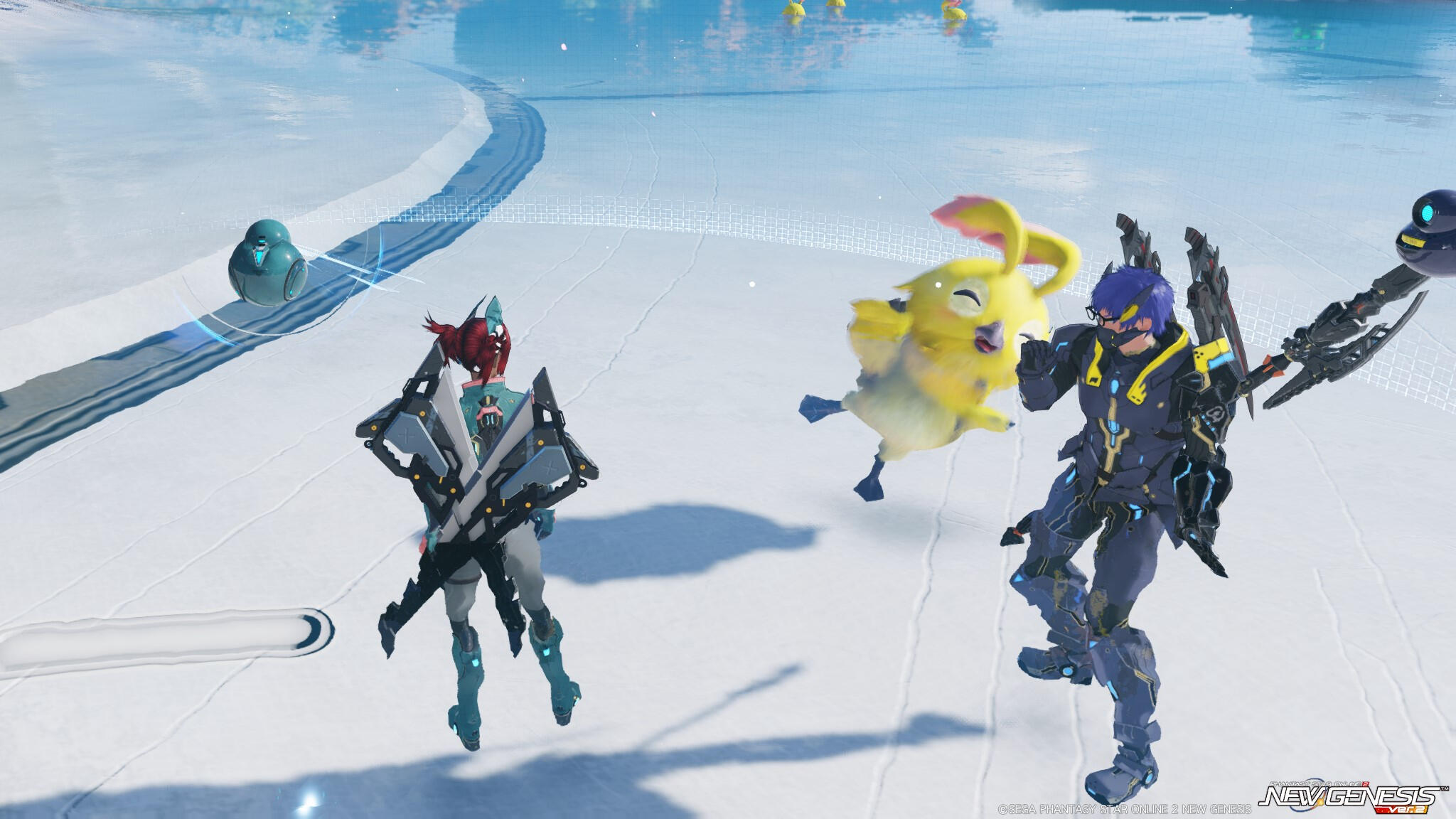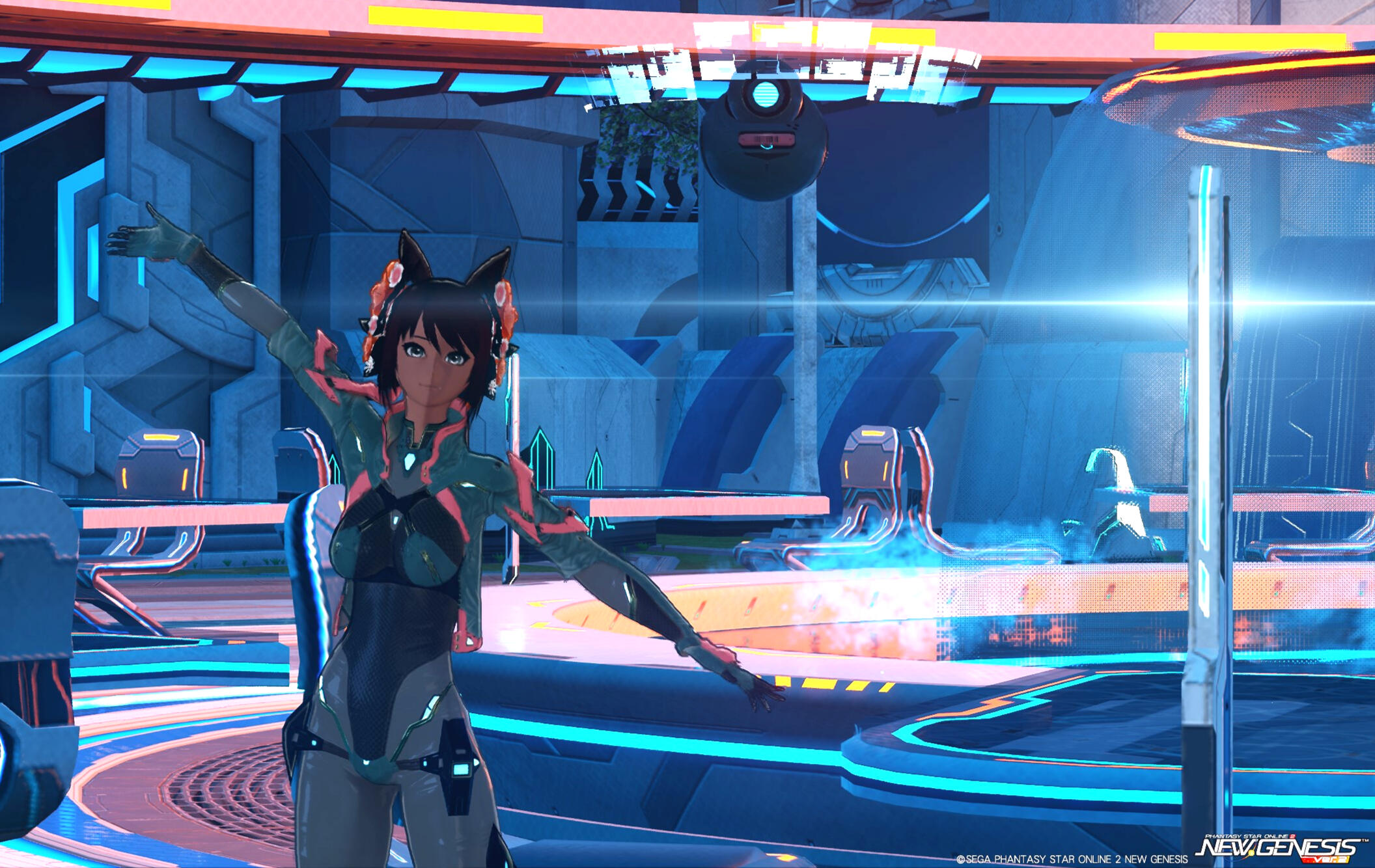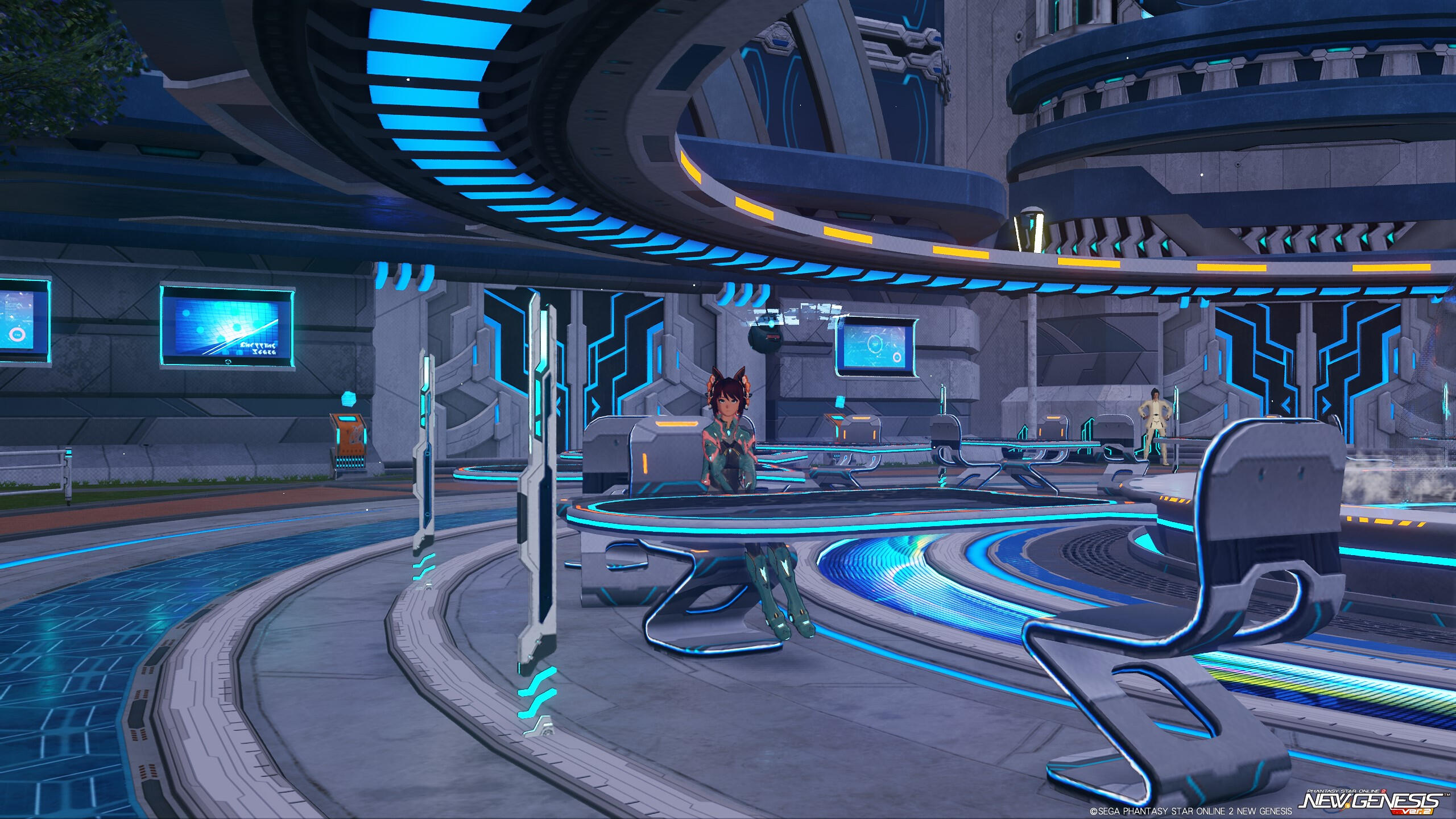 Yep, that's me! Anime Babbit with the fox ears. Our time away from Eorzea has taken us to a number of places, from Tyria to Middle-earth to...Yu-Gi-Oh Land, and now I'm sitting in a space cafe next to a fountain in Central City. What's the planet we're on called? I don't actually know, don't worry about it. Halpha, Lopp says.It's hard to say you've found a new "home" when you've only been someplace for a few days, but spending a little time in Phantasy Star Online 2: New Genesis Central City, I already feel like I've found a new place to just chill out. Middle-earth is great, don't get me wrong, and I'm far from finished there. But here? Glamours everywhere, customization galore, and fun space iceskates that I can fly around on and blast ice bolts at my enemies? What more do you want!