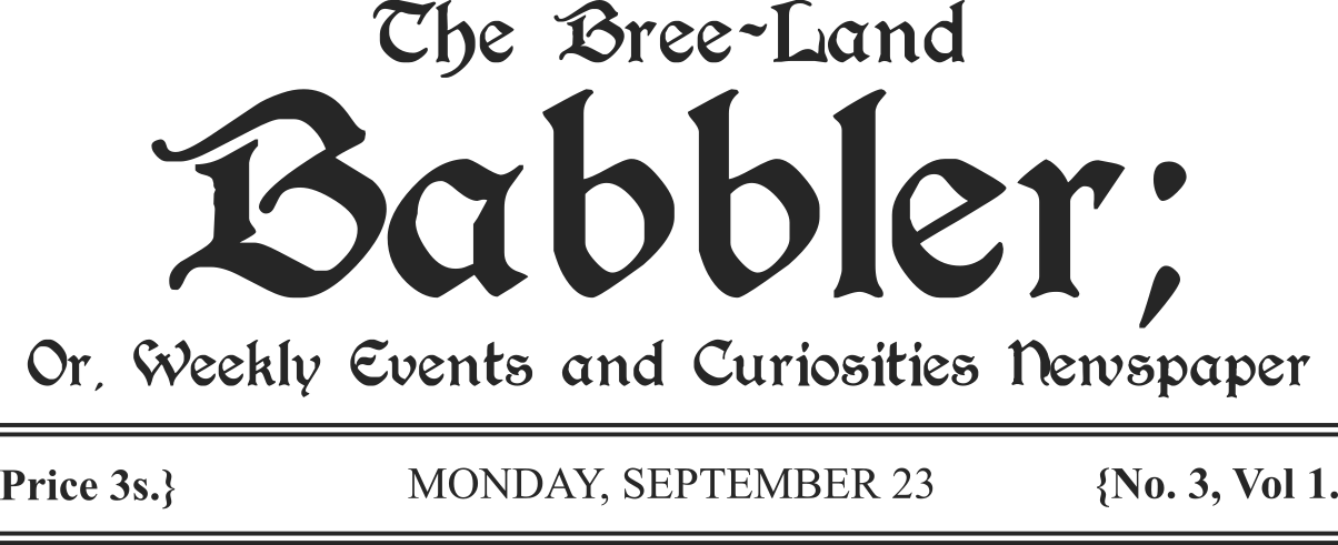 Click here to read the third issue of The Bree-Land Babbler, bringing you exclusive news from Bree and surrounding areas! This week: watermelon violence and Baggins' birthday!